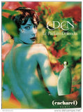 This is one of the most famous Cacharel fragrances. The opening blends luminuous citrus notes. The cold water freshness of water lily in the heart is combined with heady floral notes (tuberose, mimose, jasmine, rose and lily-of-the-valley) and sweet juicy fruits (pineapple and mellon). The water notes are in the perfect harmony with sharp patchouli and warm woody base of cedar, sandal and Tonka bean. Eden is classified as a refreshing, oriental, floral fragrance .